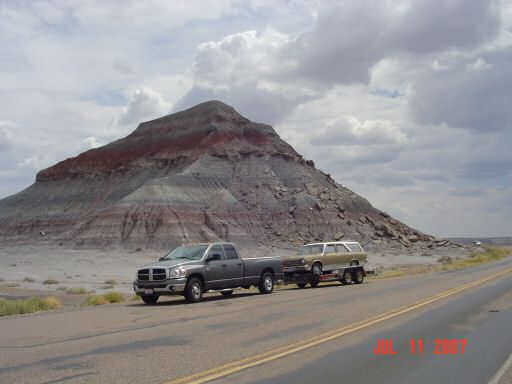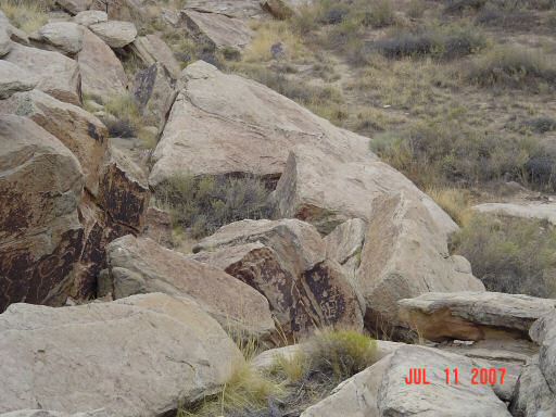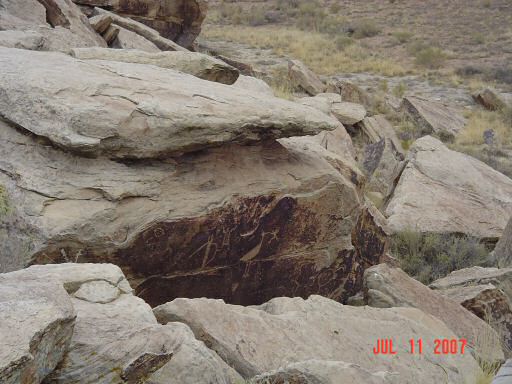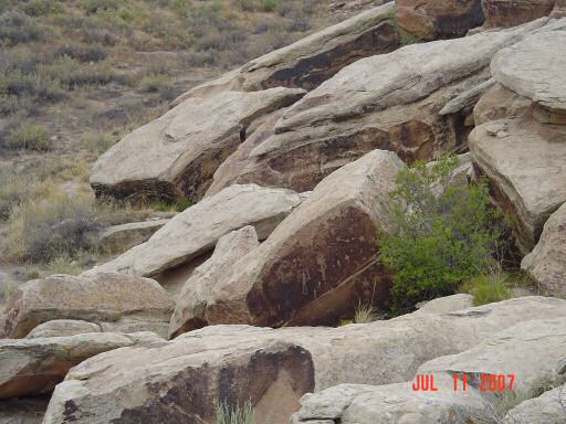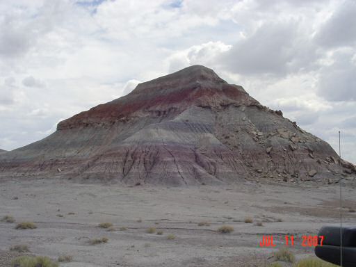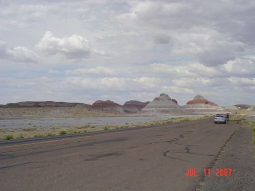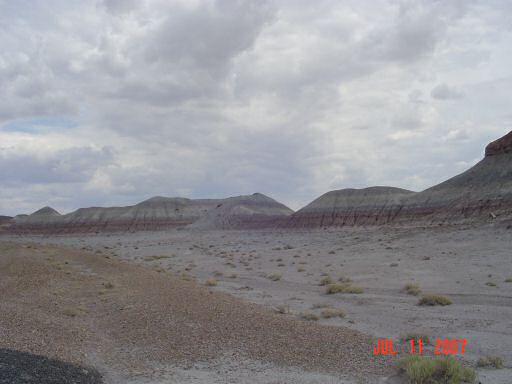 Petrified Forest and Painted DesertThe painted desert gets its name from the brightly colored layers of red sandstone mixed in with layers of gray on a backdrop of light green desert brush. After endless miles of barren desert, this is quite a site to behold. This area was also settled by several different native tribes over the centuries. One of those tribes, the Puerco Pueblo (ca. 1200 - 1300 AD), left a series of pictographs. The purpose of many of them are not known but several have been found to correspond with seasonal events such as the solstices and equinoxes.